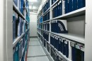 Помещение подвального типа с большим количеством коммуникаций потребовало установить стеллажи разной высоты, чтобы максимально задействовать всё рабочее пространство.