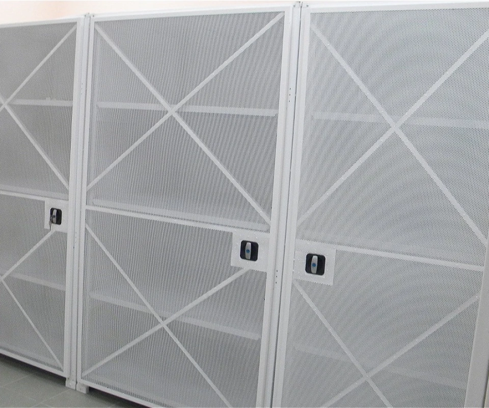 Сетчатые двери на закрывающихся стеллажах ограничивают доступ к хранимым документам и товарам, при этом позволяя легко видеть содержимое, что упрощает инвентаризацию и поиск нужных предметов.