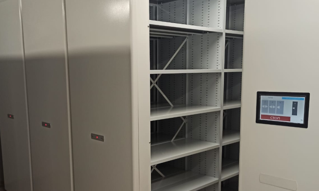 Автоматический стеллаж оснащен электроприводом и системой управления с планшета для перемещения. Он идеально подходит для больших архивов, создавая современное и технологичное решение.