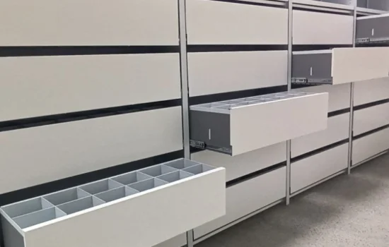 Металлические стеллажи с выдвижными ящиками могут использоваться в разных отраслях.