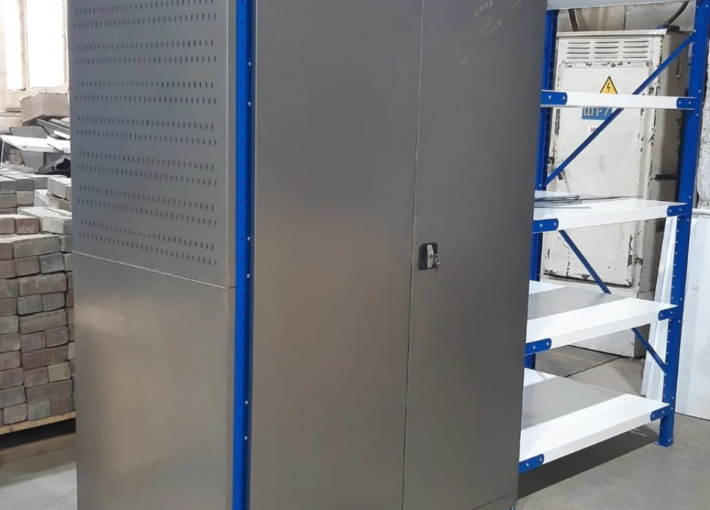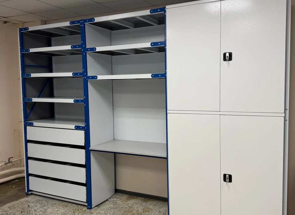 Стеллажный комплекс с рабочим местом для хранения и обработки деталей и инструментов. В стеллаж складской среднегрузовой добавлены верстаки, столы, шкафы и двери.
