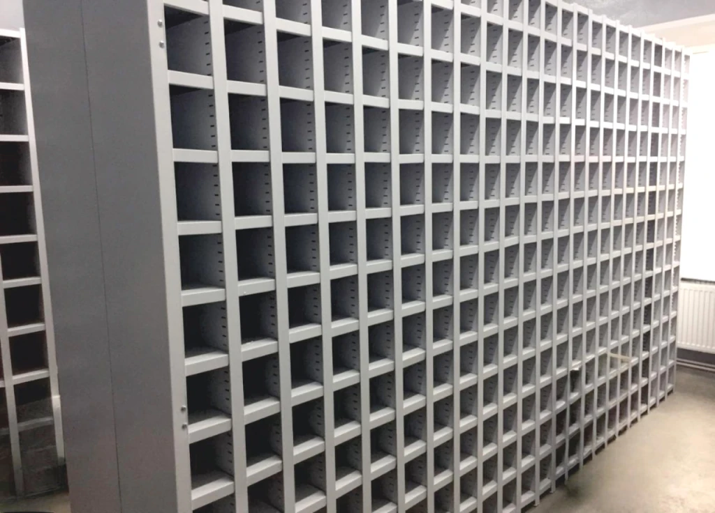 Полочный стеллаж для хранилища оснащённый съёмными разделителями, обеспечивает надёжную фиксацию папок — они не опрокидываются и не смещаются в ячейках. Такое решение представляет собой более экономичную альтернативу традиционным ячеистым шкафам.
